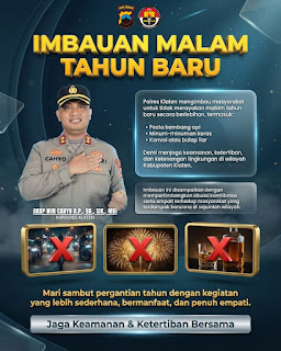 “Kami mengimbau masyarakat agar menyambut malam Tahun Baru secara sederhana dan tertib, dengan menghindari kegiatan seperti pesta kembang api, minuman keras, konvoi, maupun balap liar. Langkah ini dilakukan demi menjaga keamanan, ketertiban, dan kenyamanan bersama di Kabupaten Klaten,” Ungkap AKP Suwoto, Selasa (31/12/2025).